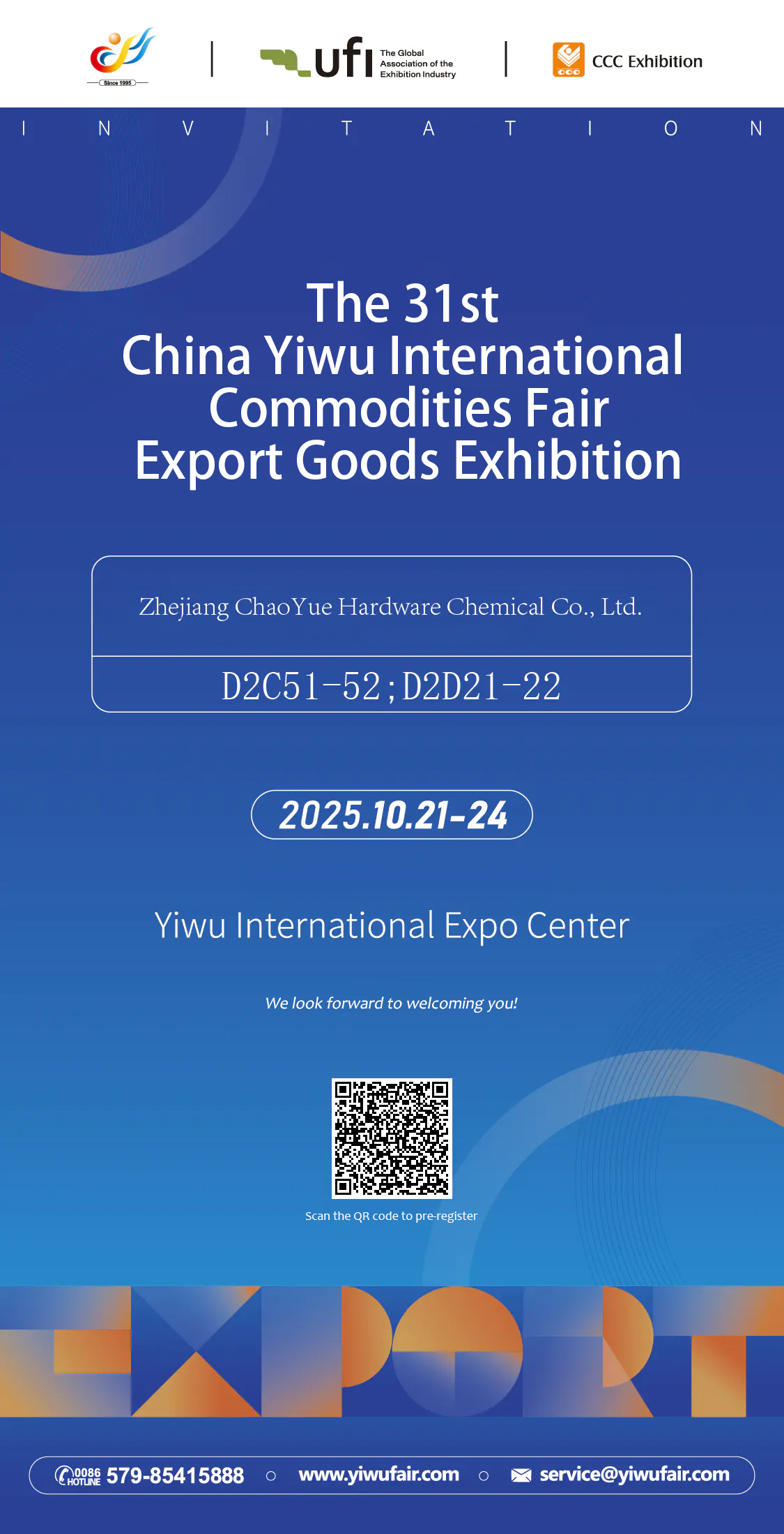 Чжэцзян ChaoYue Hardware Chemical Co., Ltd. с гордостью сообщает о своем участии в 31-й Китайской международной товарно-сырьевой ярмарке Иу – выставке экспортных товаров, которая пройдет с 21 по 24 октября 2025 года в Международном выставочном центре Иу. Приглашаем вас посетить нас на стенде № D2C51-52; Д2Д21-22.