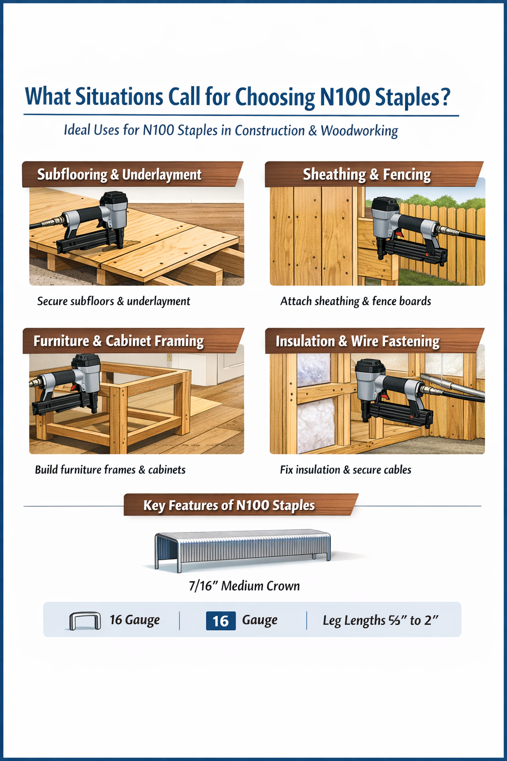 Эти качества делают скобы N100 подходящими для широкого спектра обычных строительных и отделочных задач.